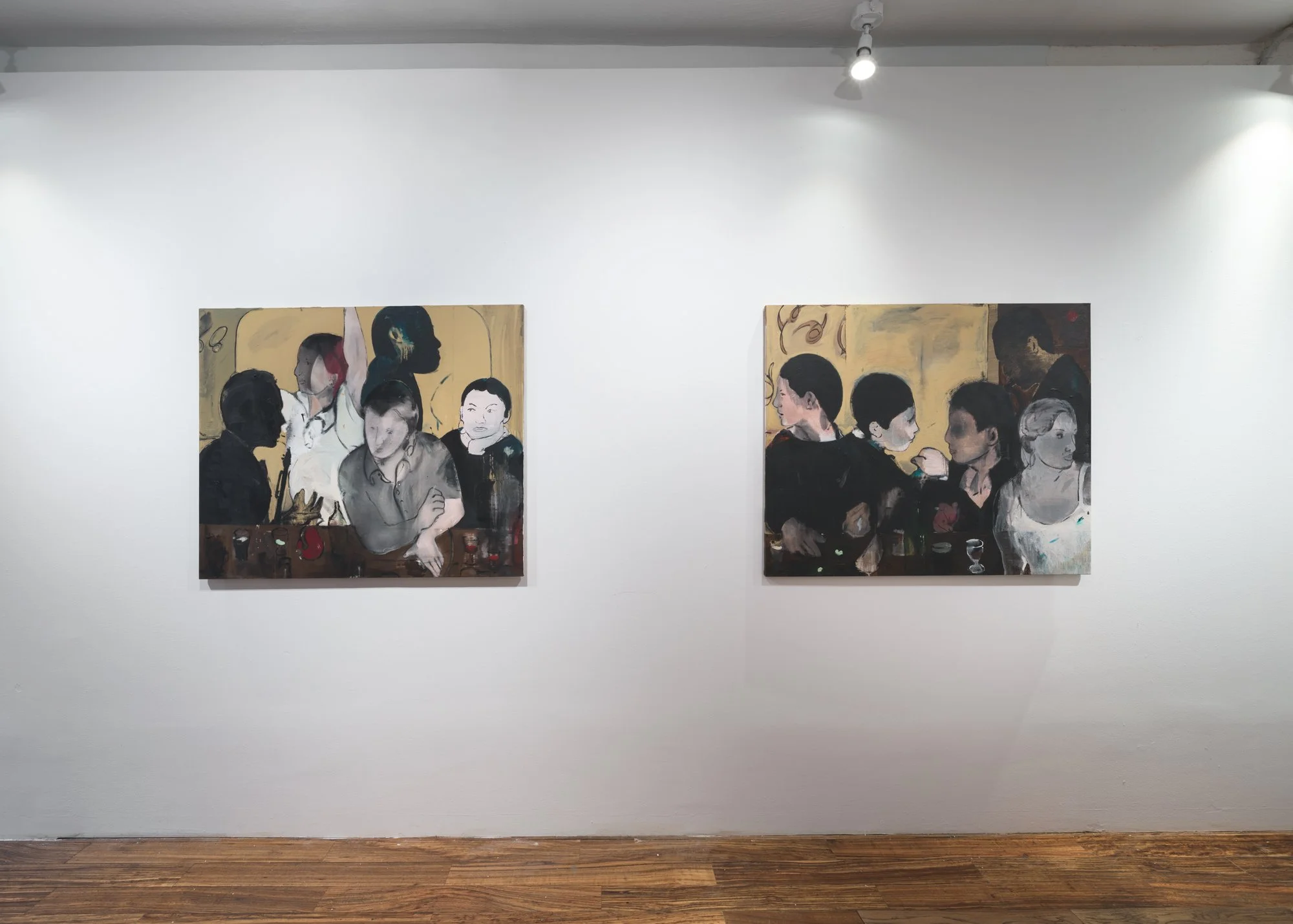 While some of the interiors resemble a bar or pub, the setting could also be a musician sitting quietly in a corner, or small groups trying to carve out a private exchange over a drink at a friend’s apartment They’re separate, strangers if you will. but occupying the same social space. Doyle cites the book “Paparazzo - The Elio Sorei Collection” as inspiration for many of the character’s poses, making these pictures “stolen moments,” both figuratively and at their origin.